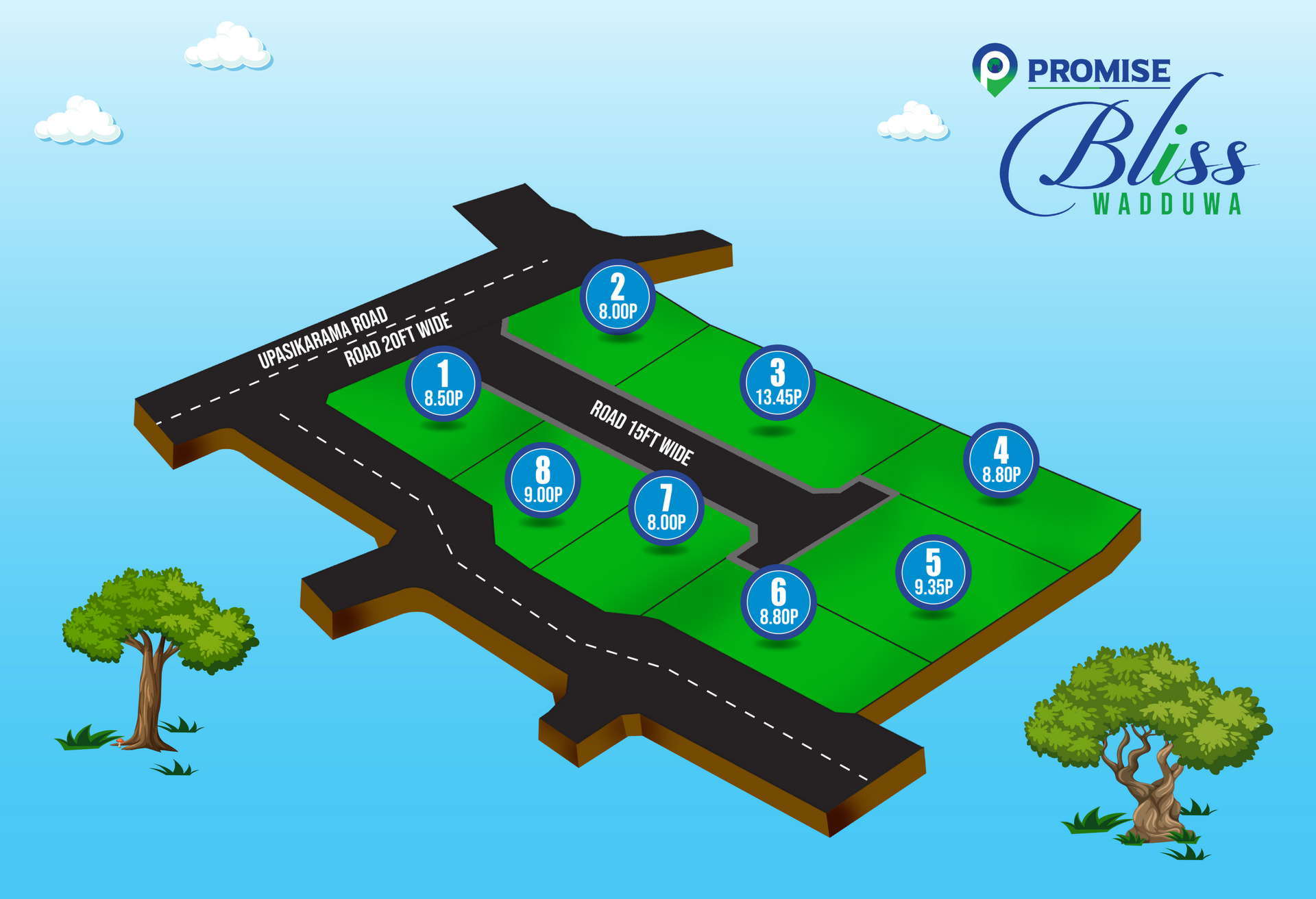 PROMIS BLISS Wadduwa. This land for sale is located in the Wadduwa Town itself, is priced at Rs.775,000/- per perch onwards Live at PROMISE BLISS Wadduwa in a serene green & urban environment, walking distance to all the modern conveniences you need. The ideal place for you to invest & build your dream home!! Reserve your 7 /8 /9 perch plot today! Call us on 0713501010. In Wadduwa town, with 3 roadways to the land. Just 200m to the main bus route!!!. Located 15 minutes to Panadura Town & close to Kalutara town. Close to Wadduwa Central College. Close to all modern amenities; hospitals, supermarkets, shops. Interlocked roadway, Electricity & Pipe water. Bank Loan facilities available. Special promotions for onetime payments & discounts for early payments.